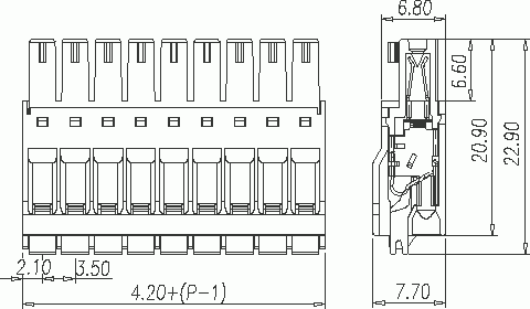 Клеммник разъемный - кабельная часть с пружинным подключением шаг 3,50 мм. Количество контактов: 4 UL: 300V/8A 24~16AWG; IEC: 250V/6A 0.5~1 мм.кв Длина зачистки проводов: 8 мм