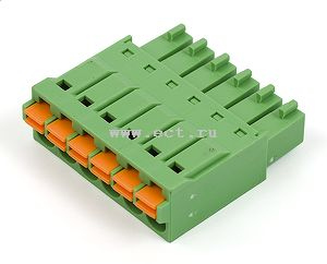 Клеммник разъемный - кабельная часть с пружинным подключением шаг 3,50 мм. Количество контактов: 6 UL: 300V/8A 24~16AWG; IEC: 250V/6A 0.5~1 мм.кв Длина зачистки проводов: 8 мм