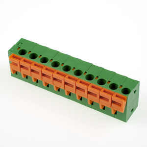 шаг: 5.08мм, пров: 1.50мм.кв, 300V, 10A, 10 конт., фронт. подкл. пруж. тип с рычагом, вых. пров. горизонт., h = 13.88мм