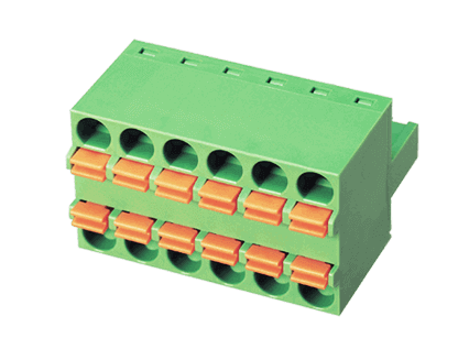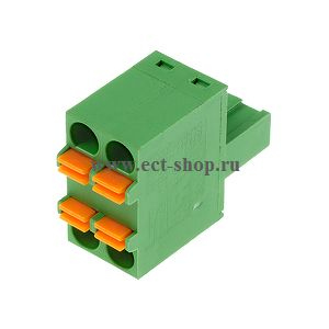 Клеммник пружинный разъемный - розетка двухрядная, кабельная часть. Шаг 5,08 мм. Количество контактов: 2 UL: 300V, 12A, 24~12 AWG. IEC: 250V, 12A, 0.5~2.5 мм.кв Цвет: зеленый