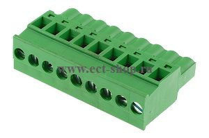 шаг: 5.08мм, пров: 2.50мм.кв, 300V, 15A, 9 конт., разъемная розетка кабельная вертикальная под винт. фиксаторы 180 град от подключения проводов., h = 26.05мм, цвет: зеленый