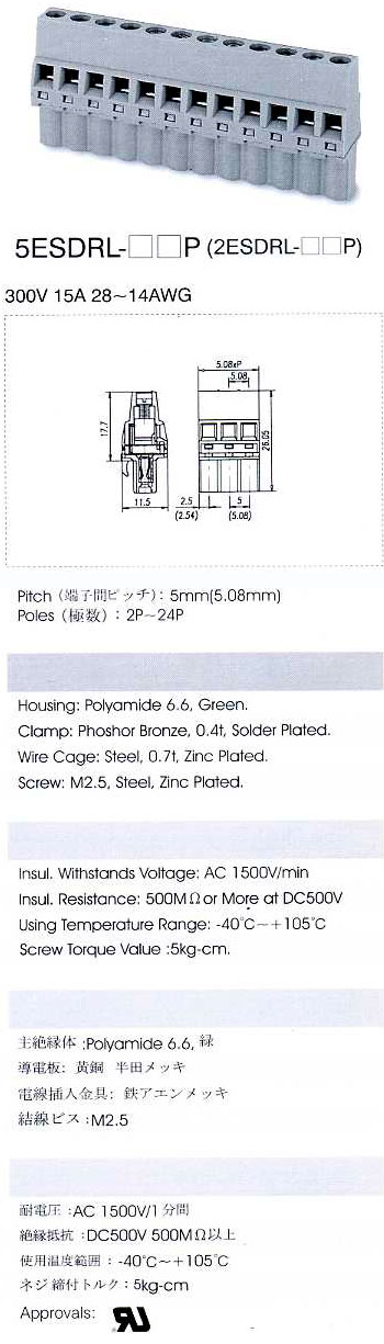 шаг: 5.08мм, пров: 2.50мм.кв, 300V, 15A, 5 конт., разъемн. розетка каб.вертик. кл. 180 град. к пров., h = 26.05мм, модель снята с производства