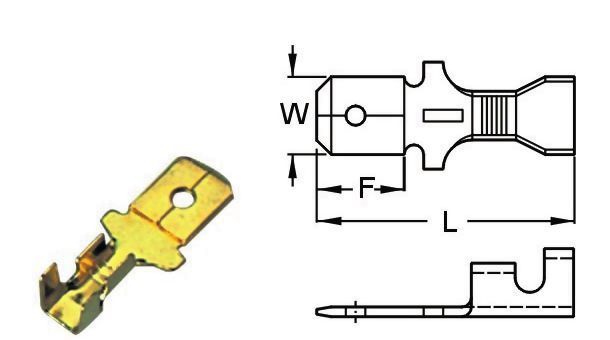 Nema tab 0.8x6.35. Незолированный кабельный штыревой плоский наконечник Faston-папа под обжим для проводов. Мат.: латунь. W= 6.3 мм, L = 20.0 мм, F = 7.2 мм. Под провода: 0.5 - 2.5 мм.кв Аналог: РП-П 2.5-7-0.8, TA-3.5MO, 36155LB