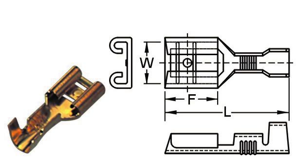 Nema tab 0.8x6.35. Неизолированный кабельный штыревой плоский наконечник Faston-мама под обжим для проводов. Мат.: латунь. W= 6.6 мм, L = 19.0 мм, F = 7.2 мм. Под провода: 0.5 - 2.5 мм.кв Аналог: TA-3.5FO, 36063LB
