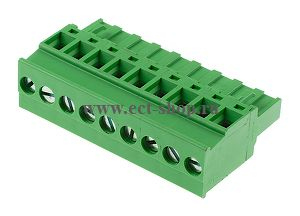 шаг: 5.00мм, пров: 2.50мм.кв, 300V, 15A, 9 конт., разъемная розетка кабельная вертикальная, фиксаторы к ответной части со стороны подключения проводов, h = 26.05мм, цвет: зеленый