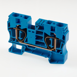 Пружинная проходная клемма на Дин рейку. UL: 600В, 51А, 24~6 AWG. IEC: 800B, 57A, 1.5~10 мм.кв, Размеры: 10х49,3х71,1 мм, Материал: полиамид. Длина зачистки проводов: 18 мм. Цвет: синий Функционально совместимый с schneider electric NSYTRR102BL, клемма Wago 2006-1204
