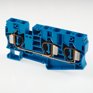 Пружинная трехконтактная клемма на Дин рейку. UL: 600В, 51А, 24~6 AWG, IEC: 800B, 57A, 1.5~10 мм.кв, Размеры: 10х49,3х96,8 мм Материал: полиамид. Длина зачистки проводов: 18 мм. Цвет: синий. Функционально совместимый с клемма Wago 2006-1304