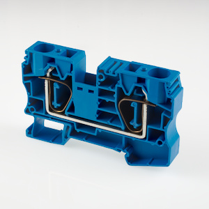 Пружинная проходная клемма на Дин рейку. UL: 600В, 66А, 24~4 AWG, IEC: 800B, 76A, 1.5~16 мм.кв, Размеры: 12х50,4х80,2 мм, Материал: полиамид. Длина зачистки проводов: 18 мм. Цвет: синий Функционально совместимы с schneider electric NSYTRR162BL, клемма Wago 2010-1204