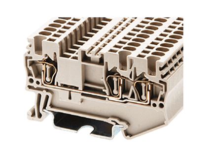 Пружинная трехконтактная клемма на Дин рейку. UL: 600В, 15А, 30~14AWG, IEC: 500B, 17.5A, 0.14~1.5 мм.кв, Размеры: 4,2х35х60,8 мм, Материал: полиамид. Длина зачистки проводов: 10 мм. Цвет: бежевый. Функциональный аналог клеммы Wago 2000-1301