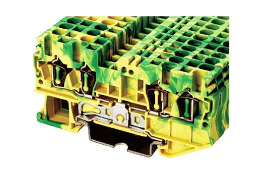 Пружинная четырехконтактная клемма заземления на Дин рейку. UL: 30~12 AWG, IEC: 0.2~2.5 мм.кв, Размеры: 5.1х35.5х72.6 мм, Материал: полиамид. Длина зачистки проводов: 10 мм. Цвет: желто-зеленый. Функционально совместимы с schneider electric NSYTRR24PE, клемма Wago 2001-1407