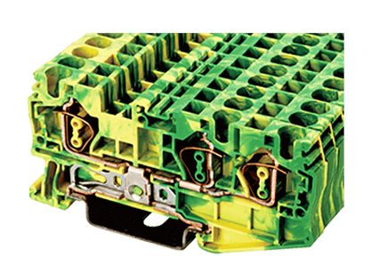 Пружинная трехконтактная клемма заземления на Дин рейку. UL: 28~10 AWG, IEC: 0.2~4.0 мм.кв, Размеры: 6.1х35х72,5 мм, Материал: полиамид. Длина зачистки проводов: 10 мм. Цвет: желто-зеленый. Функционально совместимы с schneider electric NSYTRR43PE, клемма Wago 2002-1307