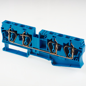 Пружинная четырехконтактная клемма на Дин рейку. UL: 600В, 35А, 24~8 AWG, IEC: 800B, 41A, 0.5~6.0 мм.кв, Размеры: 8х42х111.5 мм, Материал: полиамид. Длина зачистки проводов: 12 мм. Цвет: синий. Функционально совместимы с клеммы wago 2004-1404