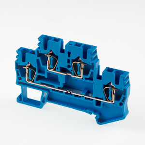 Пружинная двухуровневая клемма на Дин рейку. UL: 300В, 12А, 26~14AWG IEC: 500B, 17.5A, 0.14~1.5 мм.кв Размеры: 4,2х46х68 мм Материал: полиамид. Длина зачистки проводов: 10 мм. Цвет: синий
