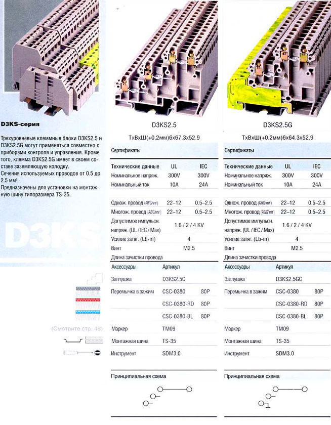 Трехуровневая винтовая клемма на Дин рейку. UL: 300В, 10А, 22~12 AWG IEC: 300B, 24А, 0.2~2.5 мм.кв Размеры: 6,0х67,3х52,9 мм Материал: полиамид. Длина зачистки проводов: 10-12 мм. Цвет: бежевый