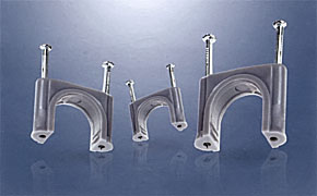 Держатель круглого кабеля, клипса с гвоздями. Материал: полипропилен. A = 50 mm, R = 42 mm. Гвозди 4х68