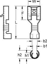 Nema tab 0.8x6.35. Неизолированный кабельный штыревой плоский наконечник Faston-мама под обжим для проводов; Двойной обжим. сеч.провода: 0.5-1.5 мм2; W= 6.8 мм, L = 19.2 мм, F = 7.5 мм, b1 = 2.0 мм, b2 = 2.0 мм, h1 = 2.5 мм, h2 = 4.0 мм, Т = 0.4 мм. мат.: луженая латунь