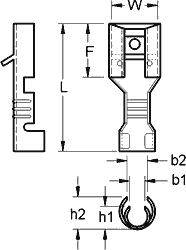 Nema tab 0.8x6.35. Неизолированный кабельный штыревой плоский наконечник Faston-мама под обжим для проводов; Двойной обжим. сеч.провода: 1.5-2.5 мм2; W= 6.8 мм, L = 19.2 мм, F = 7.5 мм, b1 = 2.2 мм, b2 = 3.0 мм, h1 = 3.6 мм, h2 = 5.0 мм, Т = 0.4 мм. мат.: луженая латунь