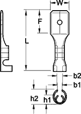 Nema tab 0.8x6.35. Неизолированный кабельный штыревой плоский наконечник Faston-папа под обжим для проводов; Двойной обжим. сеч.провода: 4.0 - 6.0 мм2; W= 6.3 мм, L = 20.0 мм, F = 8.0 мм, b1 = 5.3 мм, b2 = 6.3 мм, h1 = 4.7 мм, h2 = 5.9 мм, Т = 0.4 мм. мат.: луженая латунь