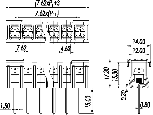 Одноуровневый баръерный клеммный блок для монтажа на печатную плату. Количество контактов: 4. Материал: Полибутилен-терафталат, UL 94 V-0; Т = -40...+130С; Шаг: 7.62 мм 300В, 15А сечение 0,5 ~2,5 мм.кв
