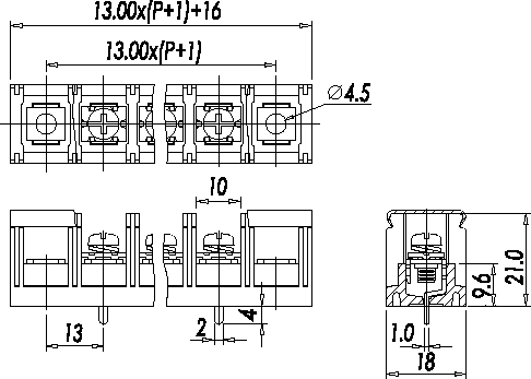 Одноуровневый баръерный клеммный блок для монтажа на печатную плату. Количество контактов: 10. Материал: Полибутилен-терафталат, UL 94 V-0; Т = -40...+120С; Шаг: 13.0 мм 600В, 40А сечение 1,0 ~10,0 мм.кв