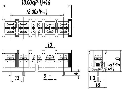 Одноуровневый баръерный клеммный блок для монтажа на печатную плату. Количество контактов: 8. Материал: Полибутилен-терафталат, UL 94 V-0; Т = -40...+120С; Шаг: 13.0 мм 600В, 40А сечение 1,0 ~10,0 мм.кв