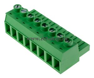 Клеммник разъемный - кабельная часть. угловой. Шаг: 10,16 мм Количество контактов: 8; UL: 300V/600V, 51A/5A, 16~6AWG; IEC: 750V, 76A, 0.5~16 мм.кв; Высота: 39 мм. Цвет: зеленый