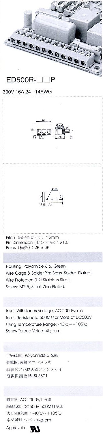 шаг: 5.00мм, пров: 2.50мм.кв, 300V, 16A, 2 конт., винт гориз., h=7.80мм/ Возможность соединения клеммников между собой. (старый дизайн)