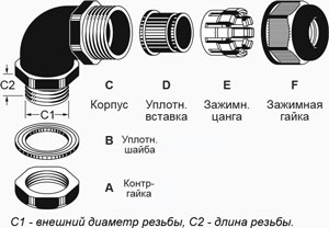 Каб.ввод угл. IP68; резьба: G (PF) 1/2 x 15; каб. d: 15~9 мм; приб. отв. d: 21~21.3 мм; цанга: разъемная; раб. T: -40C ~ +100C; мат.: A,C,E,F - полиамид (PA66 UL94V-2) и B,D - вак. рез. (EPDM NBR); цвет: cерый