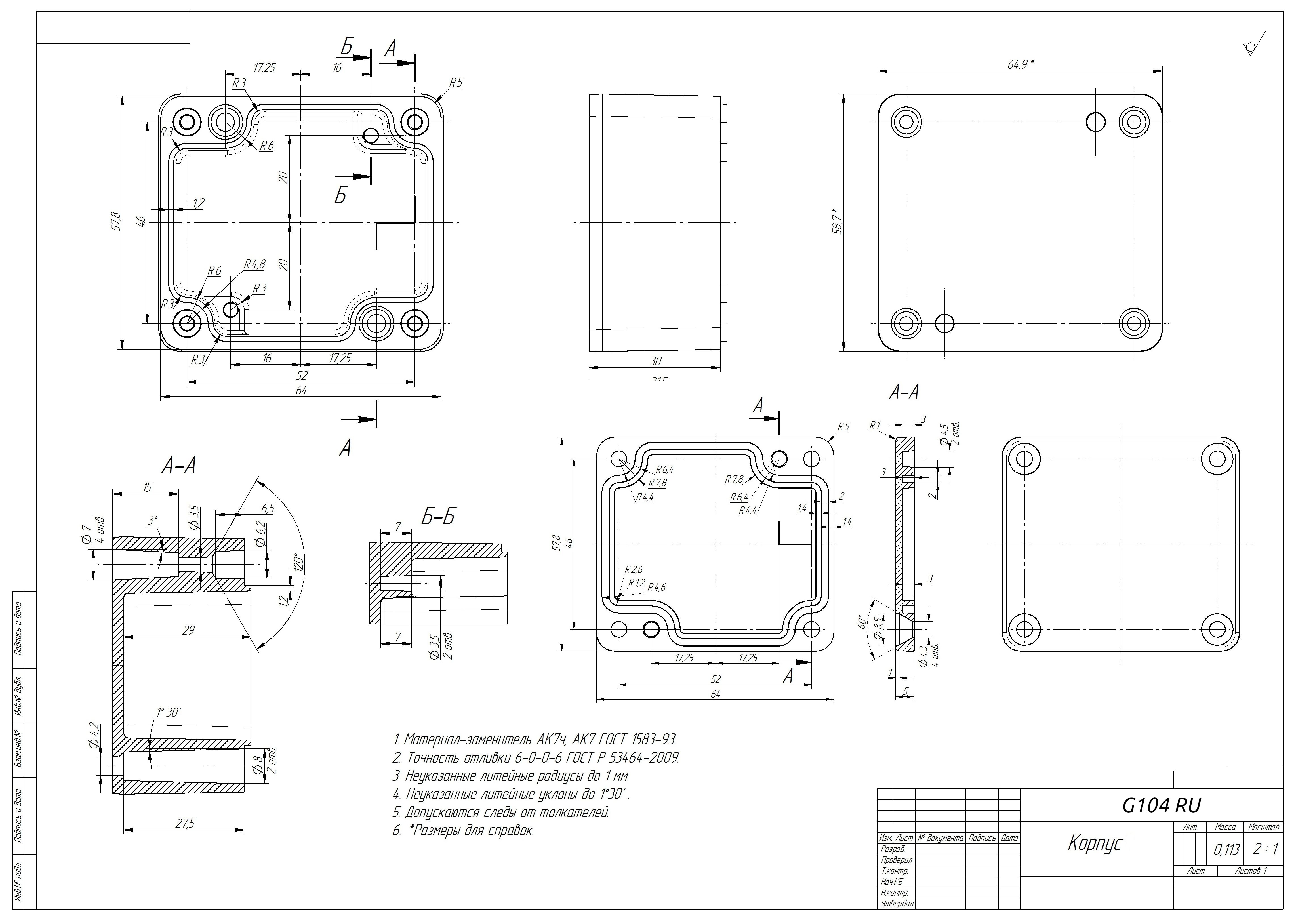 Корпус G104-RU; IP65, материал: алюминиевый сплав AK-12; размеры: 64x58x35 мм; цвет: натуральный IP65. Сделано в России.