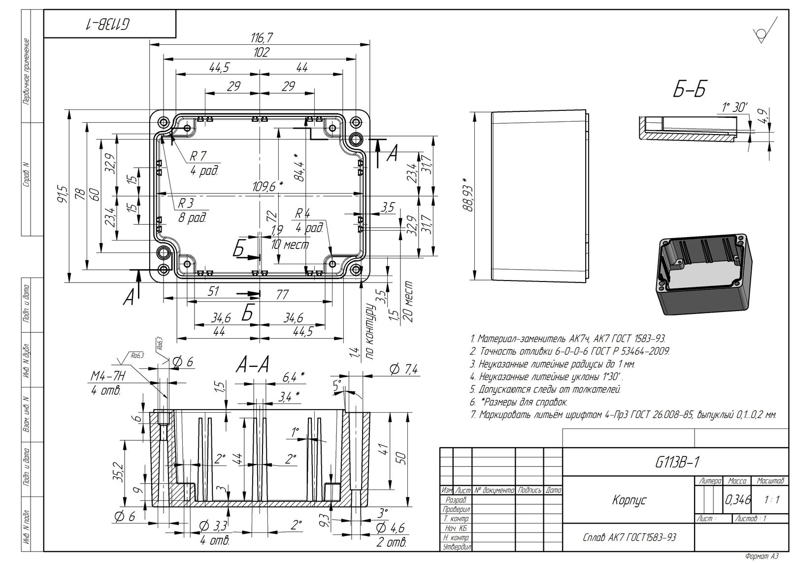 Корпус G113-RU; материал: алюминиевый сплав AK-7; размеры: 115x90x55 мм; цвет: натуральный. IP65. Сделано в России.