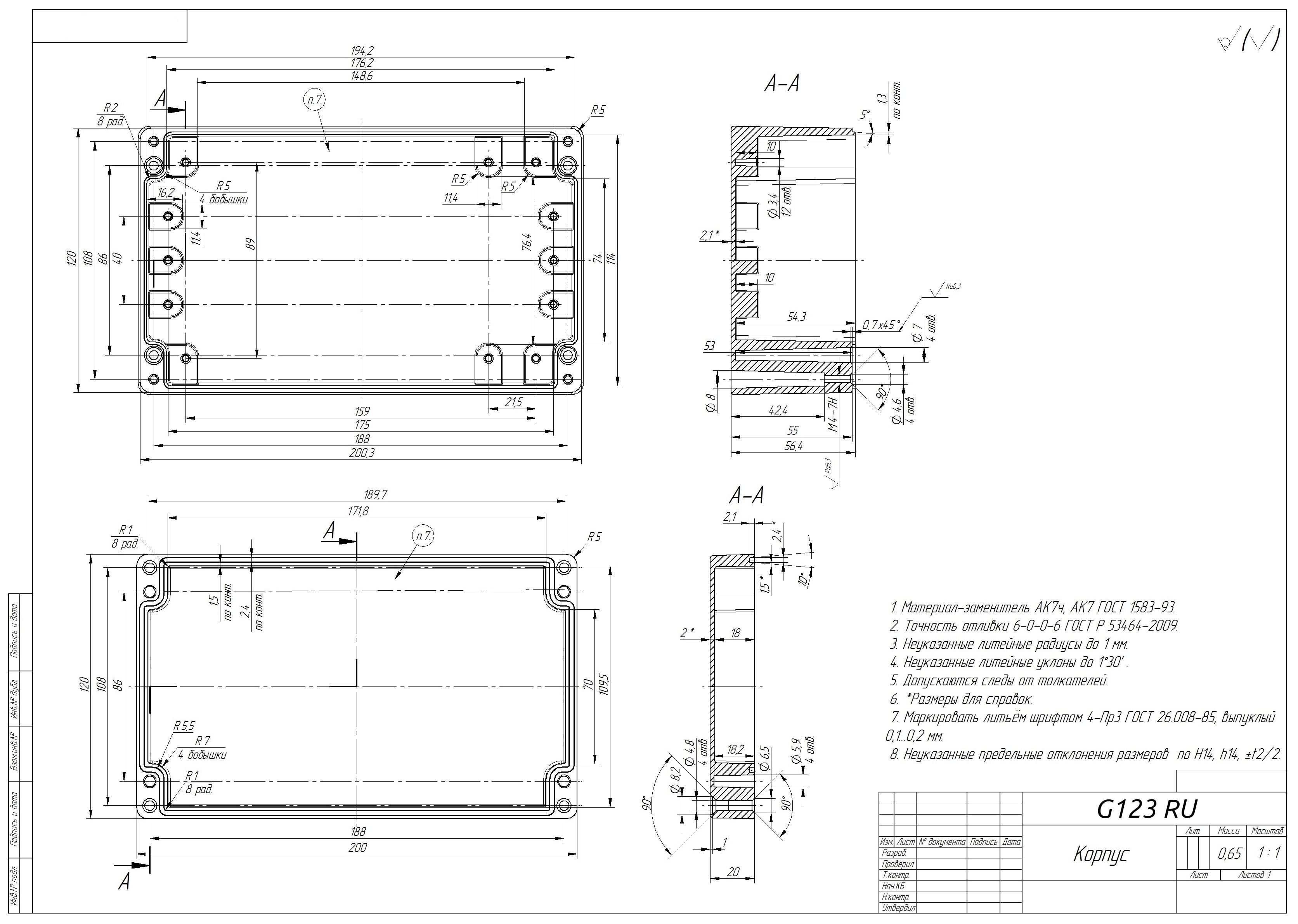 Корпус G123-RU; IP65, материал: алюминиевый сплав AK-12; размеры: 200x120x75 мм; цвет: натуральный