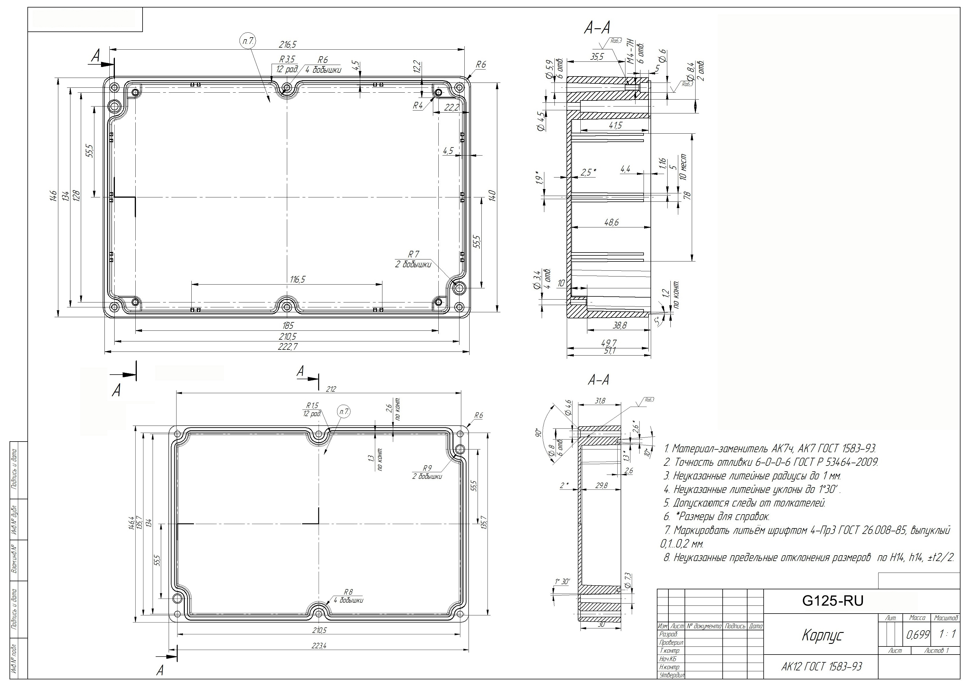 Корпус G125-RU; материал: алюминиевый сплав AK-12; размеры: 222x146x82 мм; IP65, цвет: натуральный.Сделано в России.