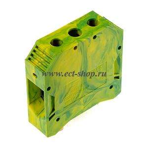 Клеммный блок GK50 на Дин-рейку с заземляющим контактом. Размер: 20х70,27х70,5 мм, пров: 16~50мм.кв, 600V, Усилие затяжки винтов клемм 7,9Nm. Длина зачистки проводов: 20~25мм. цвет: желто-зеленый