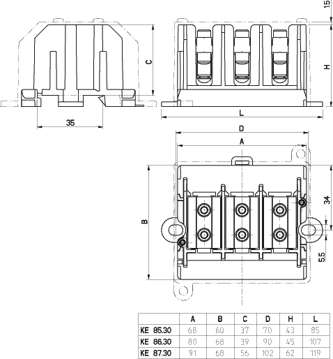 Клеммный блок универсальный ответвительный, 3 полюса, KE85.3 с защитной крышкой PEE185.3, Clampo Pro.