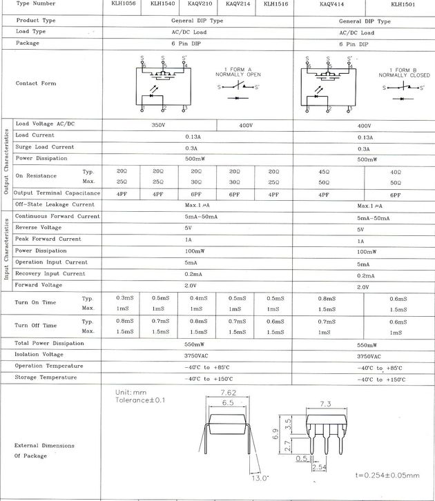 Фото-моп твердотельное реле. Корпус DIP-6, 1 нормально открытый контакт, Un=350B, In=130mA, Rз=25 Ом, tз=1мс, tр=1.5мс.