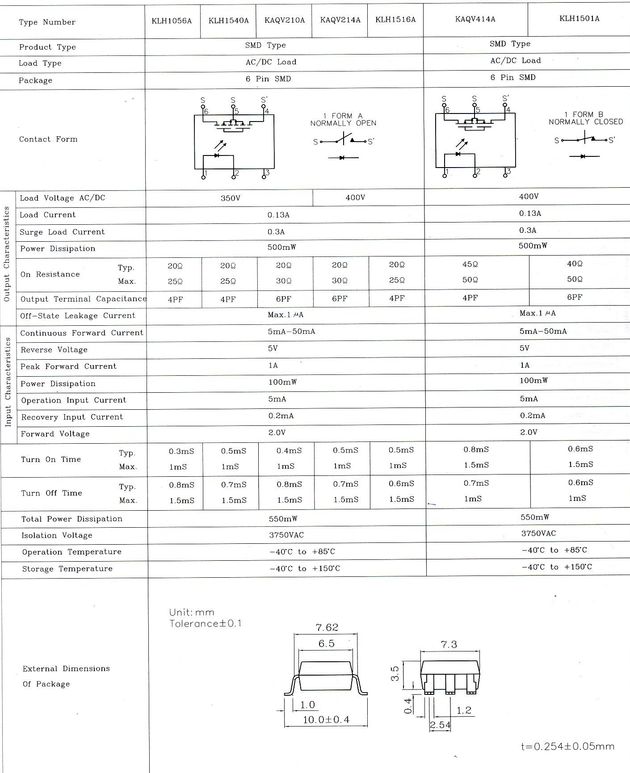 Фото-моп твердотельное реле. Корпус SMD-6, 1 нормально открытый контакт, Un=350B, In=130mA, Rз=25 Ом, tз=1мс, tр=1.5мс.