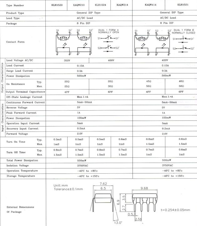 Фото-моп твердотельное реле. Корпус DIP-8, 2 нормально закрытых контакта, Un=400B, In=130mA, Rз=50 Ом, tз=1.5мс, tр=1мс. Похожие продукты: AQW414, LH1521, LBB110