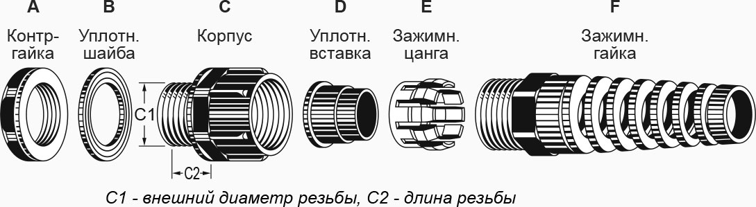 Каб.ввод IP68 с предохр.; резьба: M16 x 1.5 x 15; каб. d: 7~4 мм; приб. отв. d: 16~16.3 мм; цанга: разъемная; раб. T: -40C ~ +100C; мат.: A,C,E,F - полиамид (PA66 UL94V-2) и B,D - вак. рез. (EPDM NBR); цвет: черный