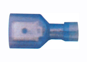 Nema tab 0.8x6.35. Полностью изолированный кабельный штыревой плоский наконечник Faston папа под обжим для проводов; Сеч.провода: 1.5-2.5 мм2; W = 6.35 мм, F = 7.7 мм, L = 24.0 мм, B = 11.0 мм, D = 4.5 мм, Т = 0.4 мм. С = 2.3 мм. мат.: луженая латунь. изоляция нейлон. Цвет синий. MAX 105C, 300B