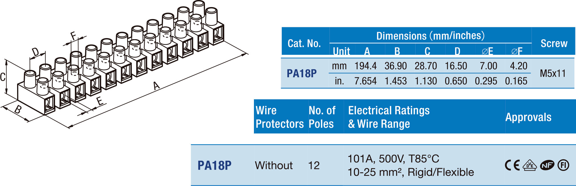 Клеммная колодка HEAVY POW. PA18P, Винтовая, 12 контактов, сечение провода 6-25 мм2, ток 101 A, Белый