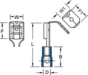 Nema tab 0.8x6.35. Изолированный кабельный штыревой плоский наконечник Faston ответвительный под обжим для проводов; Сеч.провода: 0.5 - 1.5 мм2; W = 6.6 мм, W1 = 6.35 мм, F = 8.0 мм, F1 = 8.2 мм, L = 22.0 мм, B = 10.0 мм, D = 4.0 мм, Т = 0.4 мм. С = 1.7 мм. мат.: луженая латунь. изоляция винил. Цвет красный. Max 75C, 300B