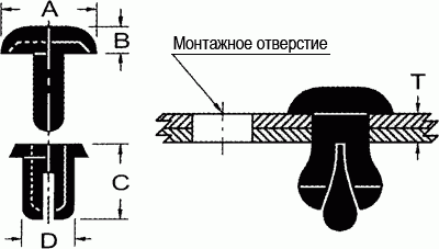 Заклепки пластиковые нейлоновые. Материал: нейлон PA66. Цвет: черный. A = 9.0 mm, B = 2.2 mm, С = 7.5 mm, D = 5 mm, T = 4.5~5.5 mm
