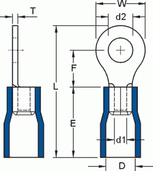 Клемма тип "О" изолированная. Цвет желтый. на провод 4.0 - 6.0 мм.кв, винт 12 мм. Материал: медь. Изоляция винил. До 50А. d2 = 13 mm, W = 19.2 mm, F = 16 mm, L = 38.6 mm, E = 13 mm, D = 6.4 mm, d1 = 3.4 mm, T = 1 mm. Max 105C, 600B