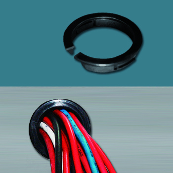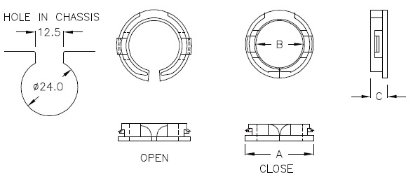Втулка изолирующая, рассеченная. Материал: полиамид 66. Цвет: черный. Установочное отверстие: 24.0 мм. Для стенки толщиной 0.8 ~1.1мм. A =26.0 мм, B=20.0 мм, С=5.3мм.