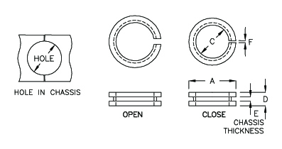 Втулка изолирующая, рассеченная. Материал: полиамид 66. Цвет: черный. Установочное отверстие: 19.0 мм. Для стенки толщиной 1.1 мм. A =22.0 мм, С=11.9 мм, D=4.8мм, F=1.2~2.3мм.