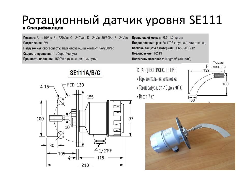 Датчик уровня ротационный. Алюминиевый корпус IP65, монтаж фланцевый 2 1/2" 5kg/cm2, саблевидная лопатка 132(30)х100 мм из нержавеющей стали, питание 24VDC, 50/60 Hz, контакт 5А/250VAC, температура -40...+70С. По спецификации модель SEX50000-AAEBCB439G0100