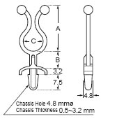 Держатель провода с защелкой в плату. Материал: полиамид 66. Цвет: натуральный. Толщина платы от 0.5 до 3.2 мм. Монтажное отверстие 4.8 мм. A = 27.2 mm, B = 22 mm, C = 11.8 mm Аналог KSS ST-2