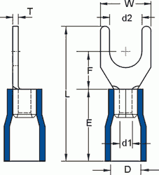 Изолированный кабельный вилочный наконечник под обжим для проводов. Цвет красный. на провод 0.5 - 1.5 мм.кв, винт 3 мм. Материал: медь. Изоляция винил. До 18А. d2 = 3.2 mm, W = 5.7 mm, F = 6.5 mm, L = 21.0 mm, E = 10 mm, D = 4.0 mm, d1 = 1.7 mm, T = 0.75 mm. Max 105C, 600B