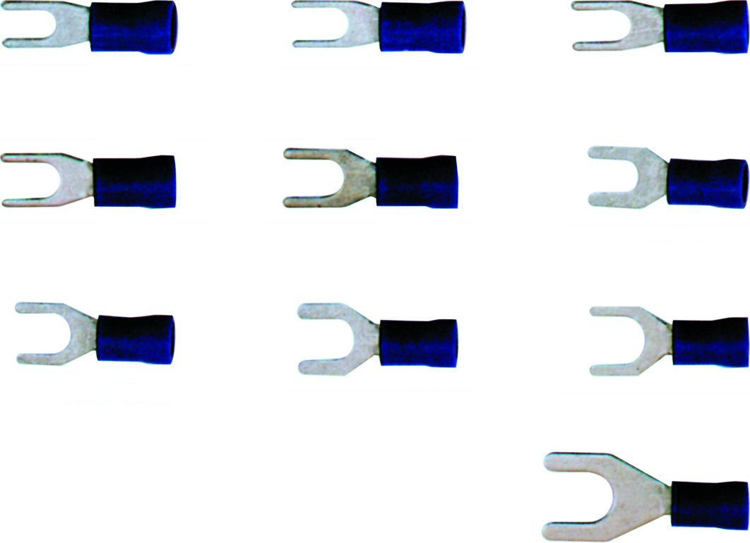 Клемма вилка тип "U" изолированная. Цвет синий. на провод 1.5 - 2.5 мм.кв, винт 5 мм. Материал: медь. Изоляция винил. До 30А. d2 = 5.3 mm, W = 7.9 mm, F = 6.5 mm, L = 21.0 mm, E = 10 mm, D = 4.5 mm, d1 = 2.3 mm, T = 0.8 mm. Max 105C, 600B