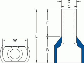 Наконечник штыревой втулочный изолированный на 2 провода; 2х1.0 мм.кв.; матер.: обжимной гильзы - медь лужёная, защитной гильзы -нейлон; гильза 10 мм; 17A; 600V; tmax=105 град C; цвет: желтый. F = 10 мм, L = 17.1 мм, W = 5.5 мм, B = 7.1 мм, D = 2.4 мм, С = 2.1 мм